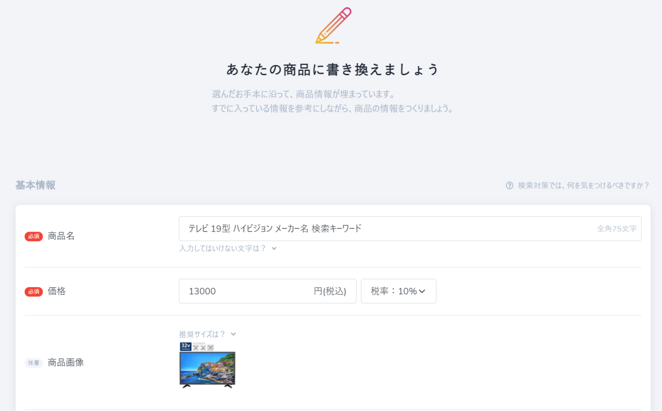 カテゴリーを作成後は、出品予定の商品について、デザインサンプルを選択し、以下のとおり順番に入力していきましょう。